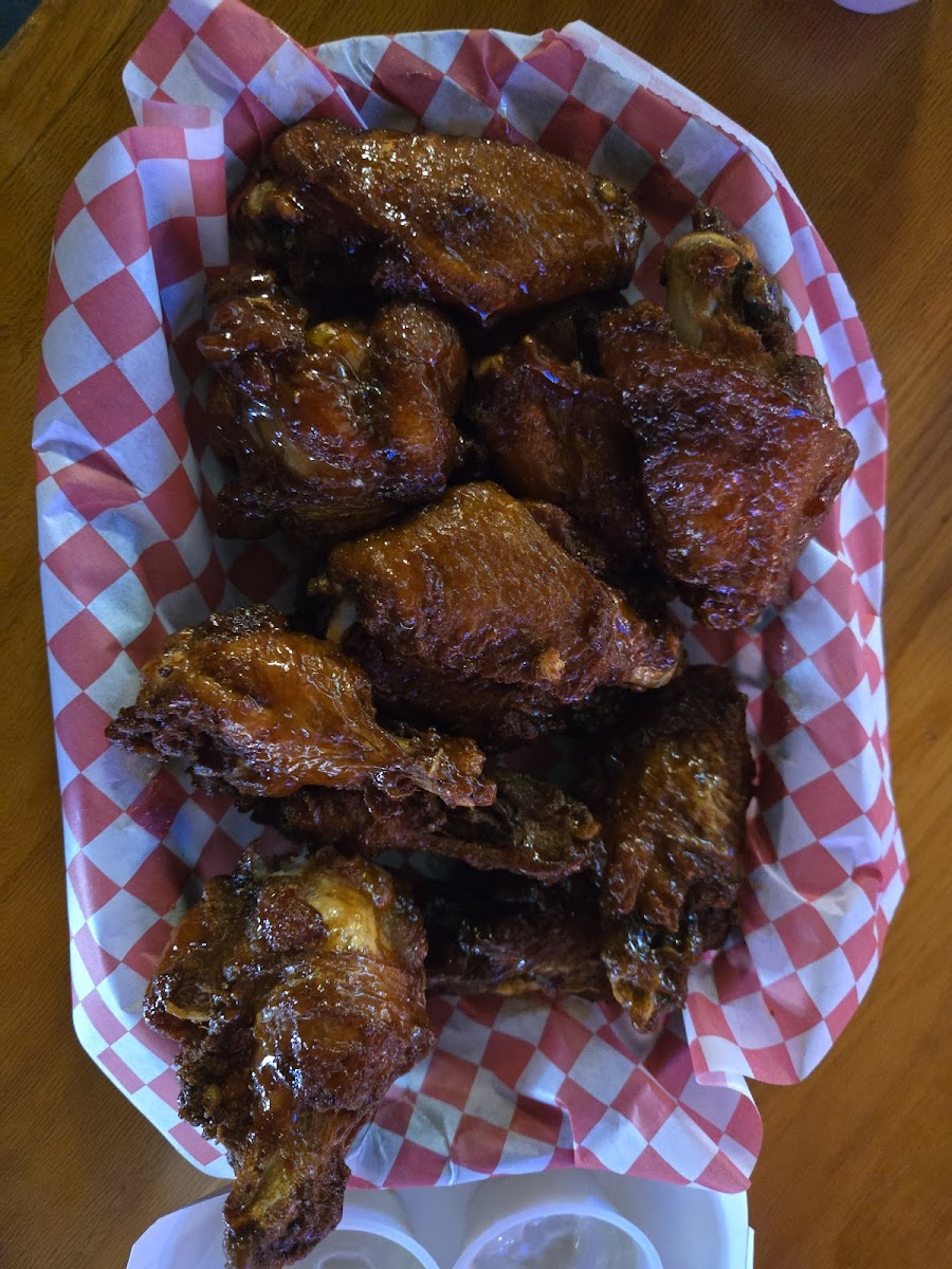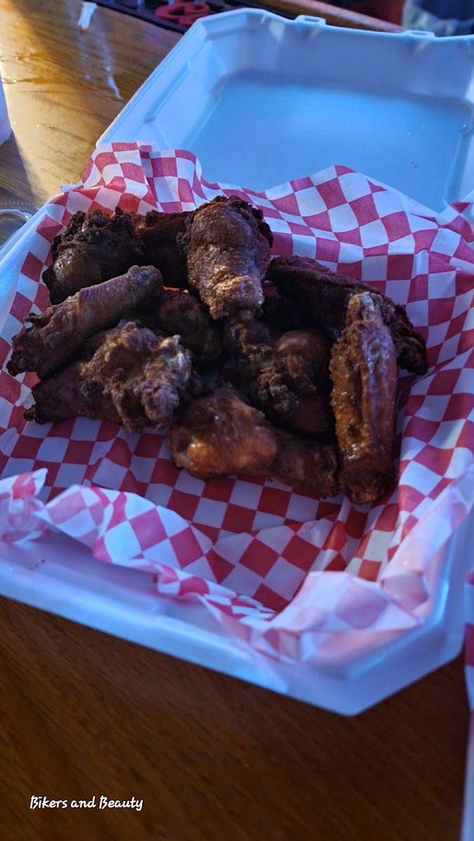Got bone in BBQ wings and mozzarella sticks and the wings were perfect. Fried then baked I would say, I ordered a dozen to go to take back to motel