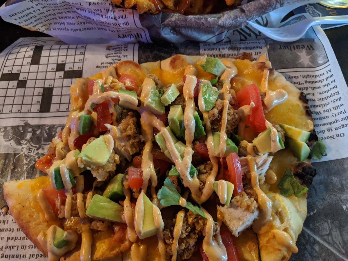 Wings were crispy and delicious. Didn't end up using the sauces other than to try them. The Mango Halbenero had a nice flavor and definitely try the garlic Sriracha dry rub, even wimps to spice like me, can enjoy it! The waffle fries were on point, crispy, and a great seasoning. Great service, we called to see how late they served food, which is 11 PM, bar time. The bartender had me call back around 10:30 so she could get my order started, and it was ready within minutes of arriving! My type of laid-back hometown bar. Chill and inviting.